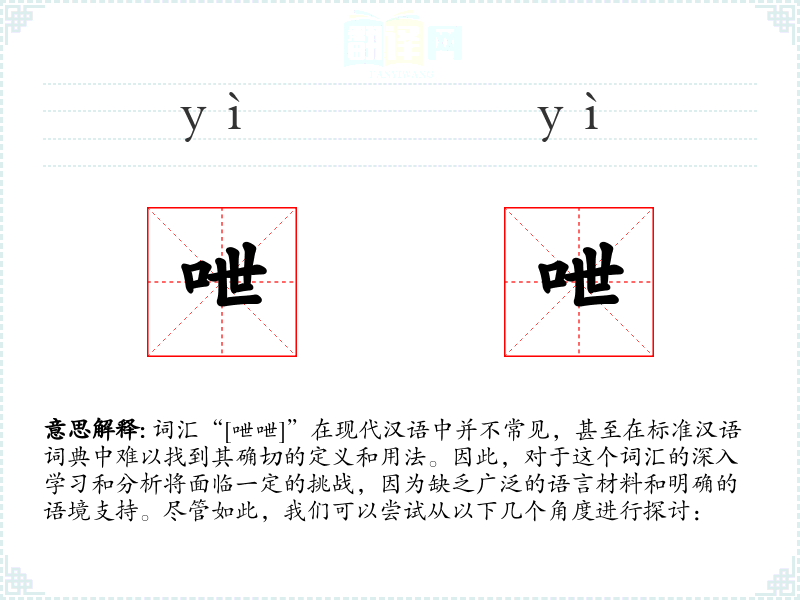 综上所述,词汇“[呭呭]”在现代汉语中缺乏明确的定义和用法,因此对其进行深入学习和分析存在较大的困难。如果这个词汇出现在特定的方言或古文献中,可能需要进一步的语言学研究来揭示其含义和用法。