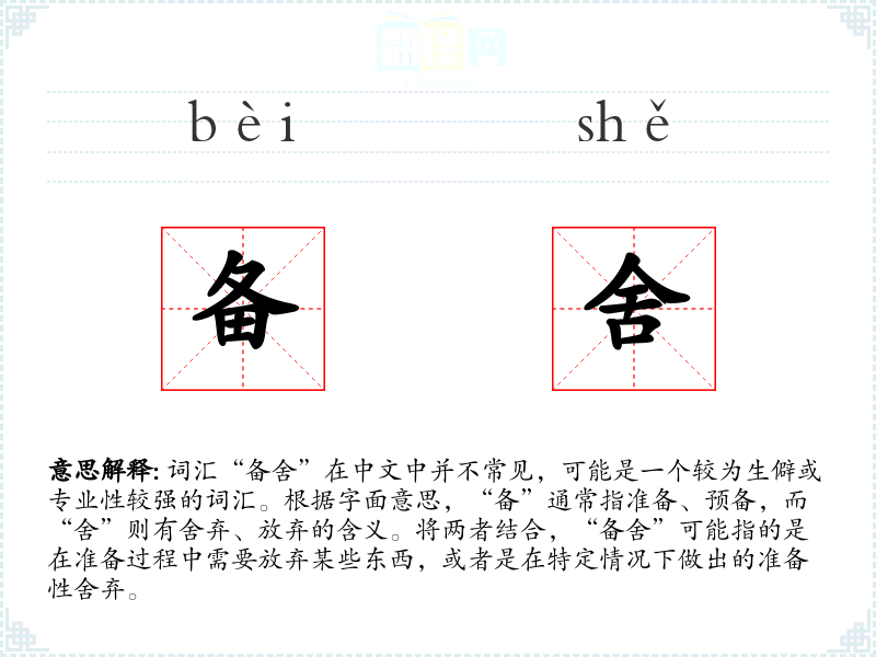 词汇“备舍”在中文中并不常见,可能是一个较为生僻或专业性较强的词汇。根据字面意思,“备”通常指准备、预备,而“舍”则有舍弃、放弃的含义。将两者结合,“备舍”可能指的是在准备过程中需要放弃某些东西,或者是在特定情况下做出的准备性舍弃。