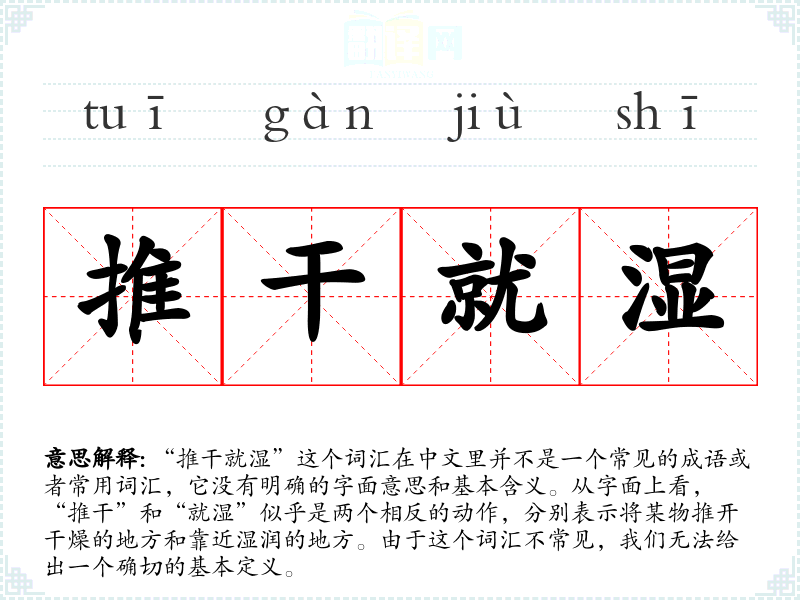 由于“推干就湿”不是一个标准词汇,它没有明确的词源和历史演变。这个词汇可能是某个特定语境下的临时创造,或者是某种方言中的表达,但这些都缺乏可靠的证据。