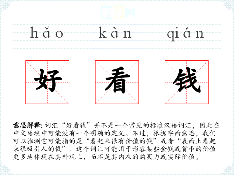 由于“好看钱”不是一个标准词汇,它的词源和演变可能不明确。它可能是近年来随着网络语言的发展而出现的一个非正式表达。