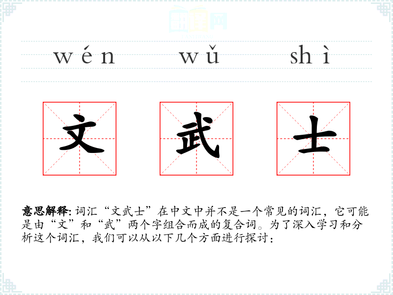 词汇“文武士”在中文中并不是一个常见的词汇,它可能是由“文”和“武”两个字组合而成的复合词。为了深入学*和分析这个词汇,我们可以从以下几个方面进行探讨: