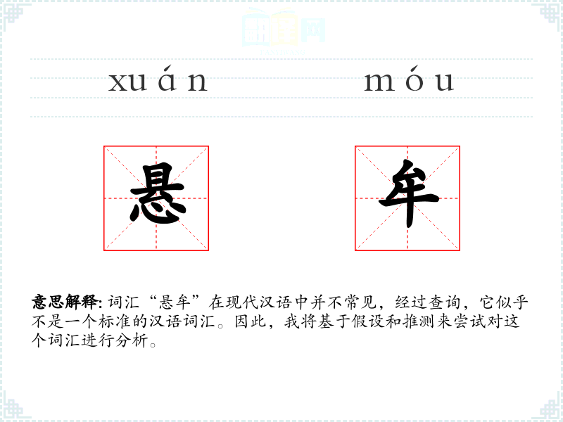 词汇“悬牟”在现代汉语中并不常见,经过查询,它似乎不是一个标准的汉语词汇。因此,我将基于假设和推测来尝试对这个词汇进行分析。