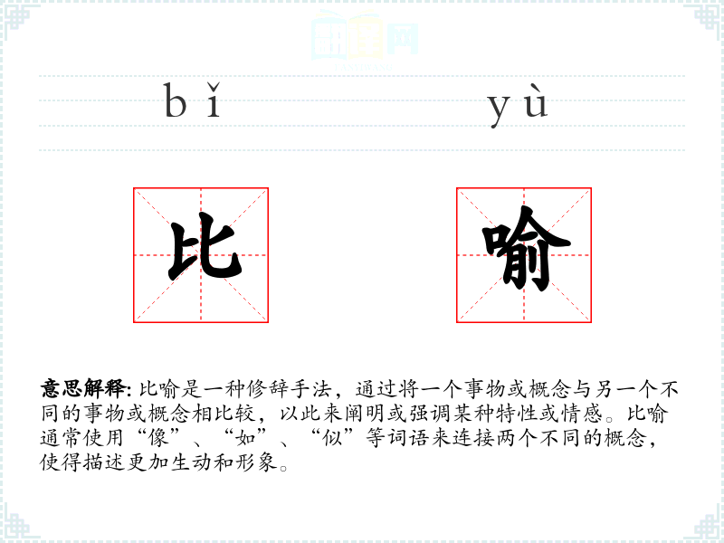 - 词源:比喻一词源自拉丁语“metaphora”,意为“转移”。