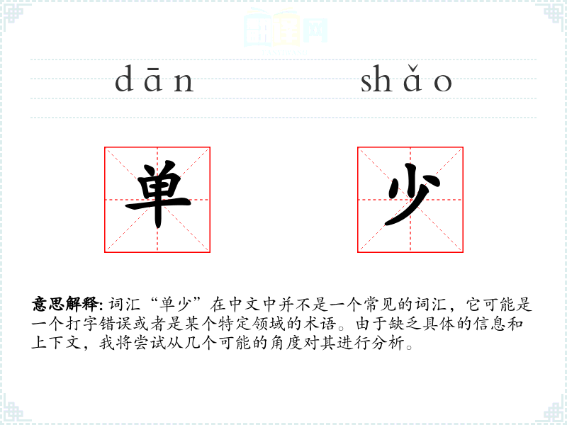 由于“单少”不是一个标准词汇,我们无法给出确切的字面意思和基本含义。它可能是“单一”和“少数”两个词汇的组合,或者是某个特定词汇的误写。