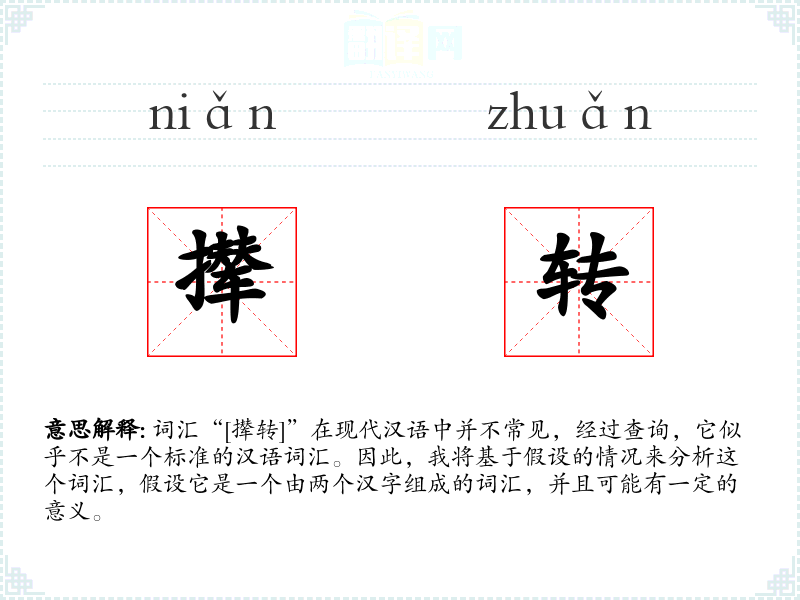 词汇“[撵转]”在现代汉语中并不常见,经过查询,它似乎不是一个标准的汉语词汇。因此,我将基于假设的情况来分析这个词汇,假设它是一个由两个汉字组成的词汇,并且可能有一定的意义。