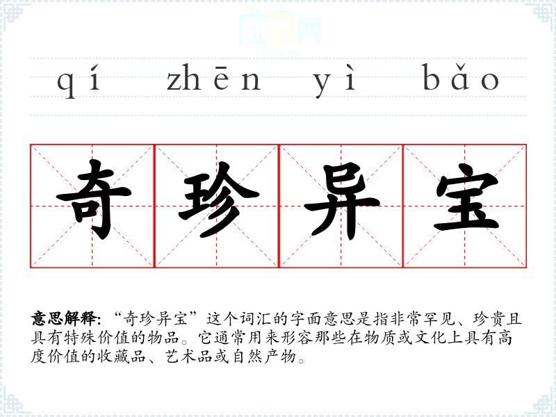“奇珍异宝”这个词汇的字面意思是指非常罕见、珍贵且具有特殊价值的物品。它通常用来形容那些在物质或文化上具有高度价值的收藏品、艺术品或自然产物。