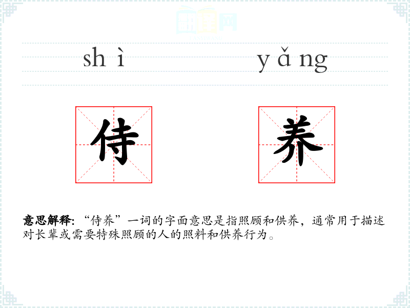 “侍养”一词的字面意思是指照顾和供养,通常用于描述对长辈或需要特殊照顾的人的照料和供养行为。