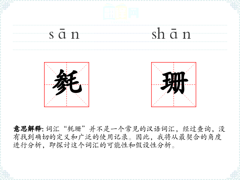 由于“毵珊”不是一个标准词汇,我们无法给出确切的基本定义。但从字面上看,“毵”字在现代汉语中不常用,而“珊”字常与“珊瑚”联系在一起,可能暗示某种与美丽或珍贵相关的含义。