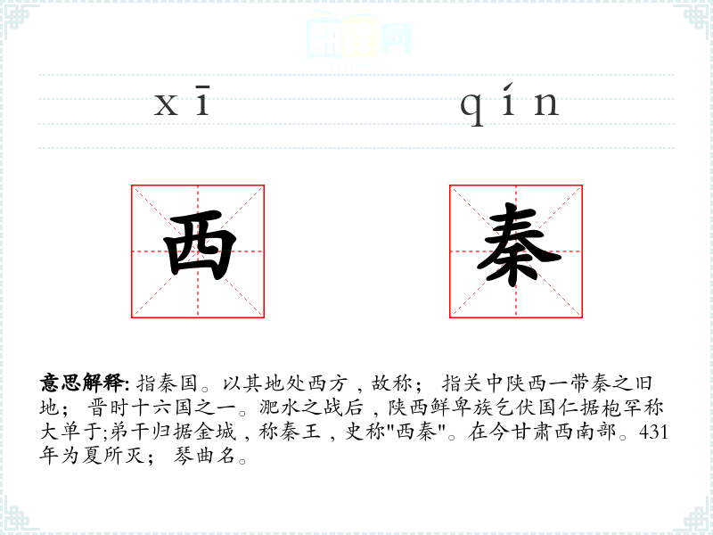 1.指秦国。以其地处西方﹐故称; 指关中陕西一带秦之旧地; 晋时十六国之一。淝水之战后﹐陕西鲜卑族乞伏国仁据枹罕称大单于;弟干归据金城﹐称秦王﹐史称"西秦"。在今甘肃西南部。431年为夏所灭; 琴曲名。