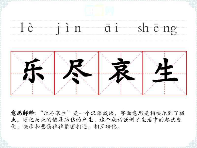 “乐尽哀生”是一个汉语成语,字面意思是指快乐到了极点,随之而来的便是悲伤的产生。这个成语强调了生活中的起伏变化,快乐和悲伤往往紧密相连,相互转化。