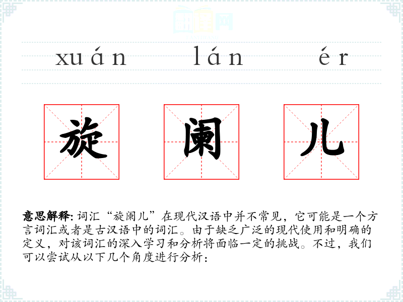 词汇“旋阑儿”在现代汉语中并不常见,它可能是一个方言词汇或者是古汉语中的词汇。由于缺乏广泛的现代使用和明确的定义,对该词汇的深入学习和分析将面临一定的挑战。不过,我们可以尝试从以下几个角度进行分析: