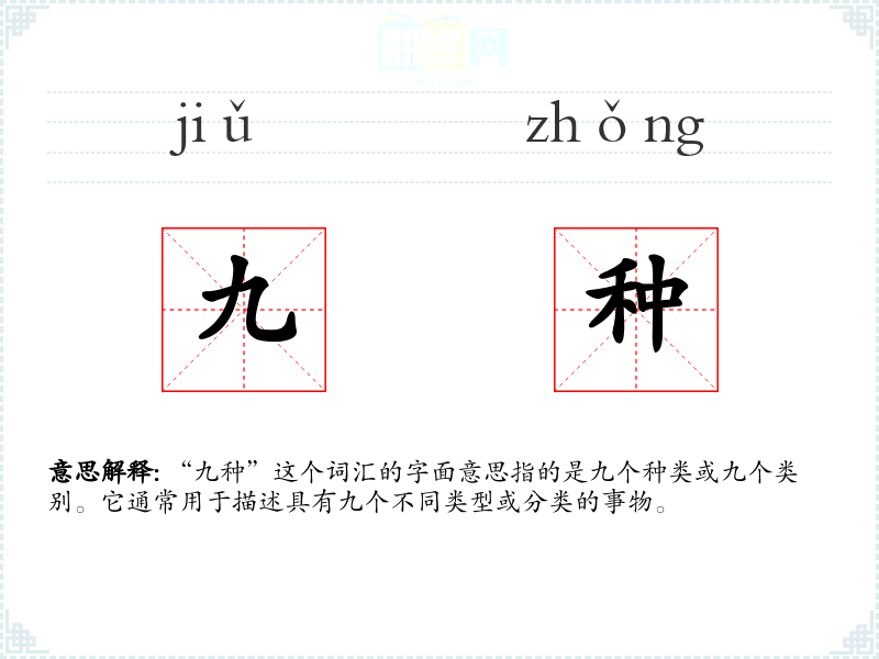 “九种”这个词汇的字面意思指的是九个种类或九个类别。它通常用于描述具有九个不同类型或分类的事物。