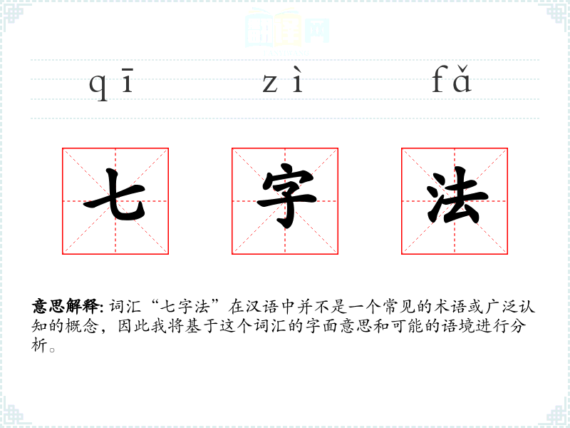 词汇“七字法”在汉语中并不是一个常见的术语或广泛认知的概念,因此我将基于这个词汇的字面意思和可能的语境进行分析。