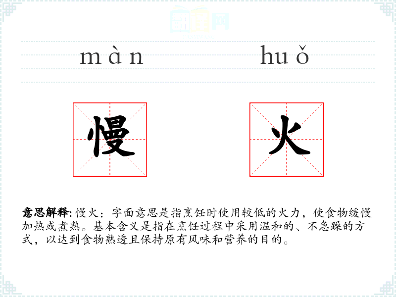 慢火:字面意思是指烹饪时使用较低的火力,使食物缓慢加热或煮熟。基本含义是指在烹饪过程中采用温和的、不急躁的方式,以达到食物熟透且保持原有风味和营养的目的。
