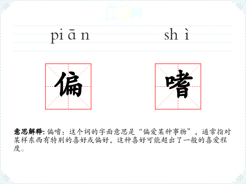 偏嗜:这个词的字面意思是“偏爱某种事物”,通常指对某样东西有特别的喜好或偏好,这种喜好可能超出了一般的喜爱程度。