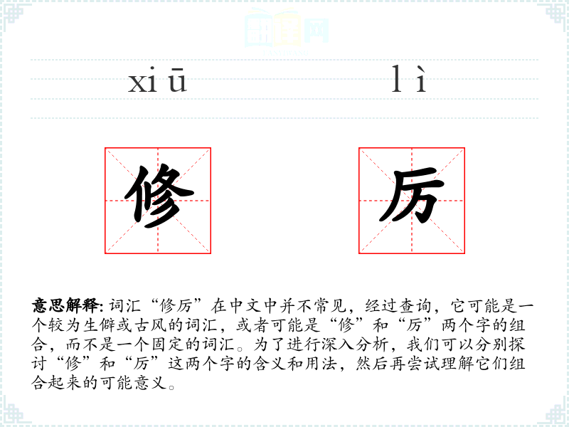 通过对“修”和“厉”的分析,我们可以理解到“修厉”可能指的是一种通过严格要求自己来不断提升和完善的状态。在语言学*和表达中,了解和掌握这样的词汇可以帮助我们更准确地表达复杂的概念和情感。