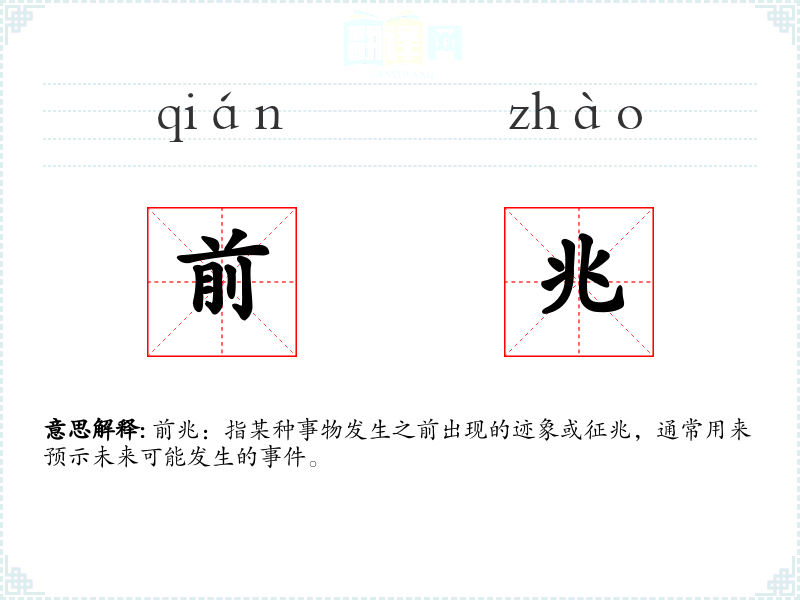 - 词源:前兆一词源自古代汉语,由“前”和“兆”组成,“前”表示时间上的先前,“兆”表示迹象或征兆。