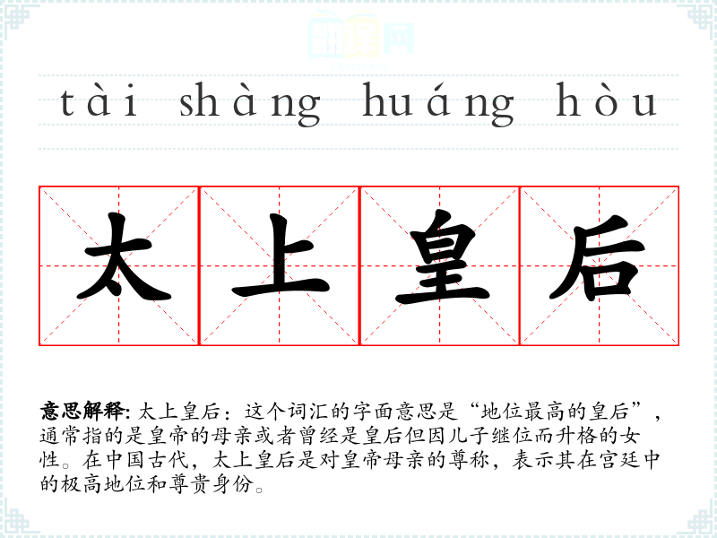 同义词:皇太后、太后 反义词:皇后(指现任**的妻子,地位低于太上皇后)