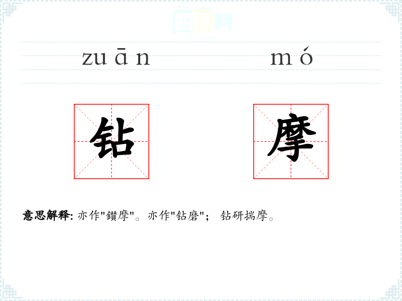 亦作"鑚摩"。亦作"钻磨"; 钻研揣摩。