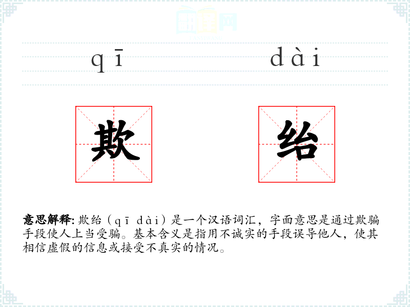 欺绐(qī dài)是一个汉语词汇,字面意思是通过欺骗手段使人上当受骗。基本含义是指用不诚实的手段误导他人,使其相信虚假的信息或接受不真实的情况。