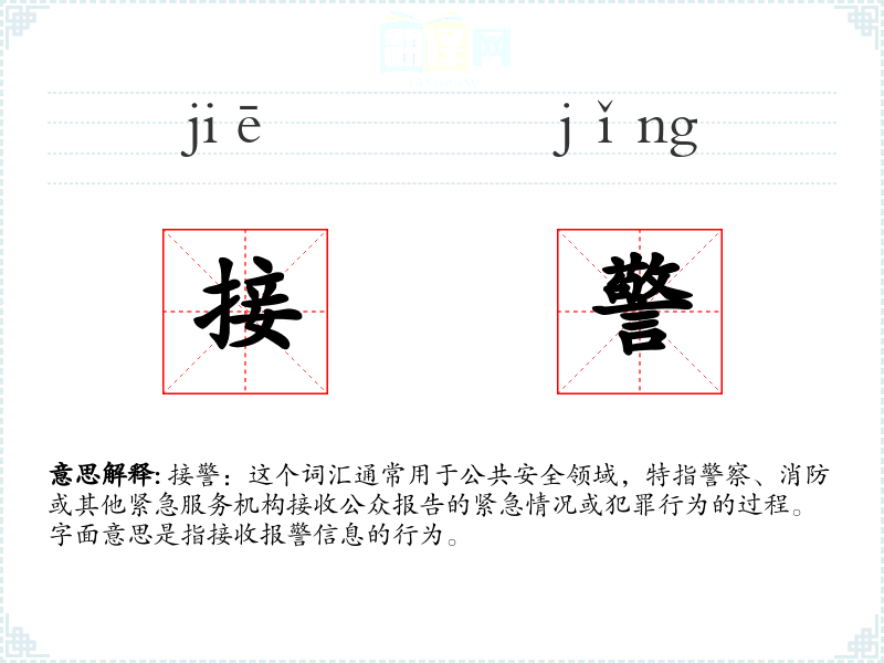 接警:这个词汇通常用于公共安全领域,特指警察、消防或其他紧急服务机构接收公众报告的紧急情况或犯罪行为的过程。字面意思是指接收报警信息的行为。