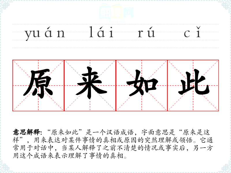 “原来如此”是一个汉语成语,字面意思是“原来是这样”,用来表达对某件事情的真相或原因的突然理解或领悟。它通常用于对话中,当某人解释了之前不清楚的情况或事实后,另一方用这个成语来表示理解了事情的真相。