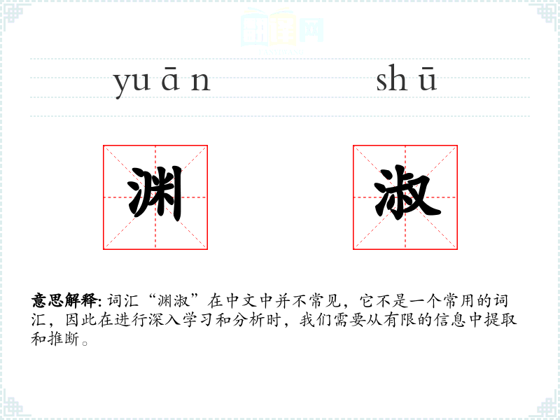 由于“渊淑”不是一个常用词汇,它在文学作品中可能出现,用以形容人物的高尚品质或事物的深邃内涵。在口语和专业领域中,这个词汇可能不太常见。
