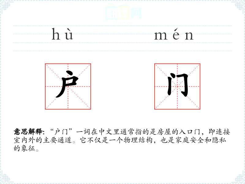 - 反义词:后门、侧门(这些词虽然不是直接的反义词,但在某些语境下可以表示与“户门”相对的位置或用途)