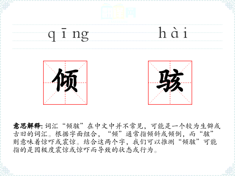 由于“倾骇”是一个较为生僻的词汇,其词源和历史演变可能难以追溯。它可能是由“倾”和“骇”两个字组合而成的复合词,用以表达一种极端的心理状态。