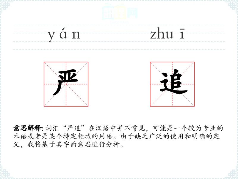 词汇“严追”在汉语中并不常见,可能是一个较为专业的术语或者是某个特定领域的用语。由于缺乏广泛的使用和明确的定义,我将基于其字面意思进行分析。