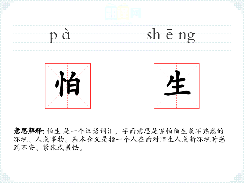 怕生 这个词源于汉语,由“怕”和“生”两个字组成。在古代汉语中,“怕”表示害怕,“生”表示陌生或不熟悉。随着语言的发展,这个词逐渐固定下来,用来描述人们在陌生环境中的心理状态。