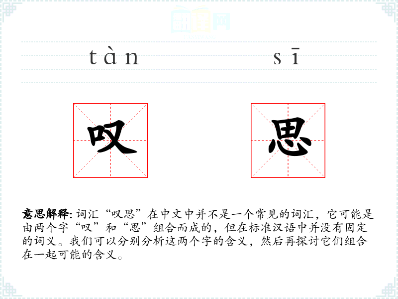 词汇“叹思”在中文中并不是一个常见的词汇,它可能是由两个字“叹”和“思”组合而成的,但在标准汉语中并没有固定的词义。我们可以分别分析这两个字的含义,然后再探讨它们组合在一起可能的含义。