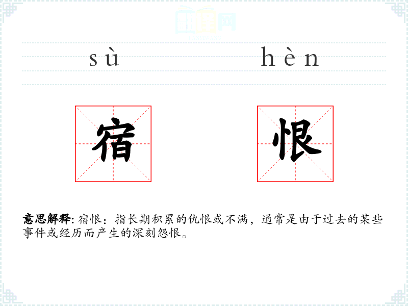 宿恨:指长期积累的仇恨或不满,通常是由于过去的某些**或经历而产生的深刻怨恨。
