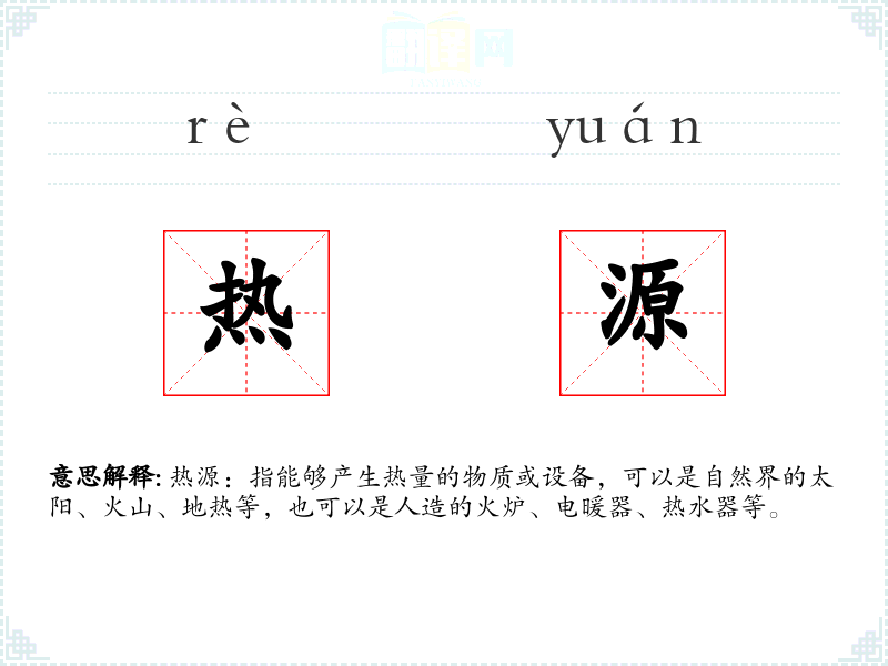- 词源:热源一词由“热”和“源”两个字组成,“热”指温度高,“源”指来源或起源。