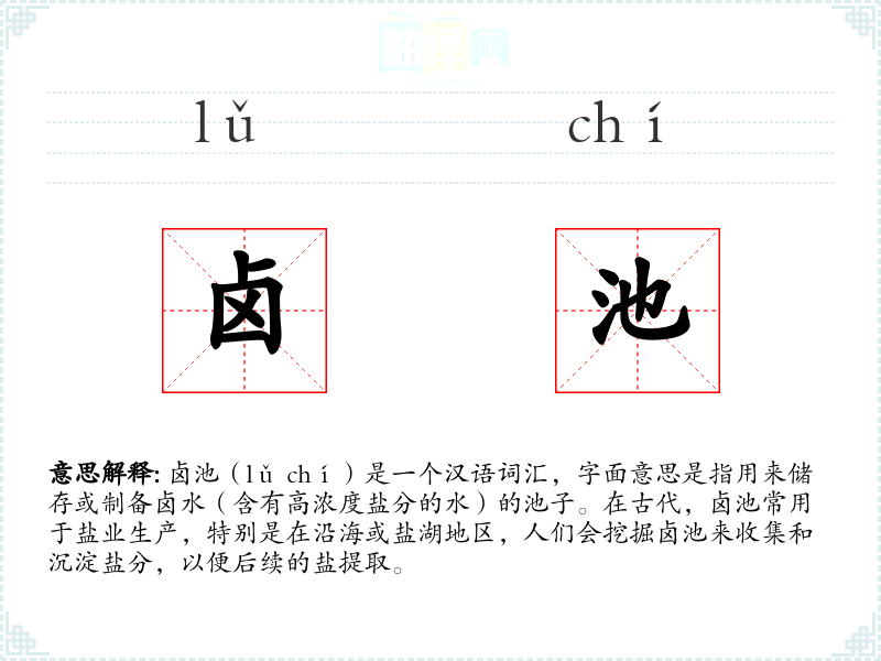 卤池(lǔ chí)是一个汉语词汇,字面意思是指用来储存或制备卤水(含有高浓度盐分的水)的池子。在古代,卤池常用于盐业生产,特别是在沿海或盐湖地区,人们会挖掘卤池来收集和沉淀盐分,以便后续的盐提取。