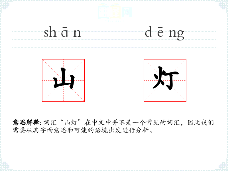词汇“山灯”在中文中并不是一个常见的词汇,因此我们需要从其字面意思和可能的语境出发进行分析。
