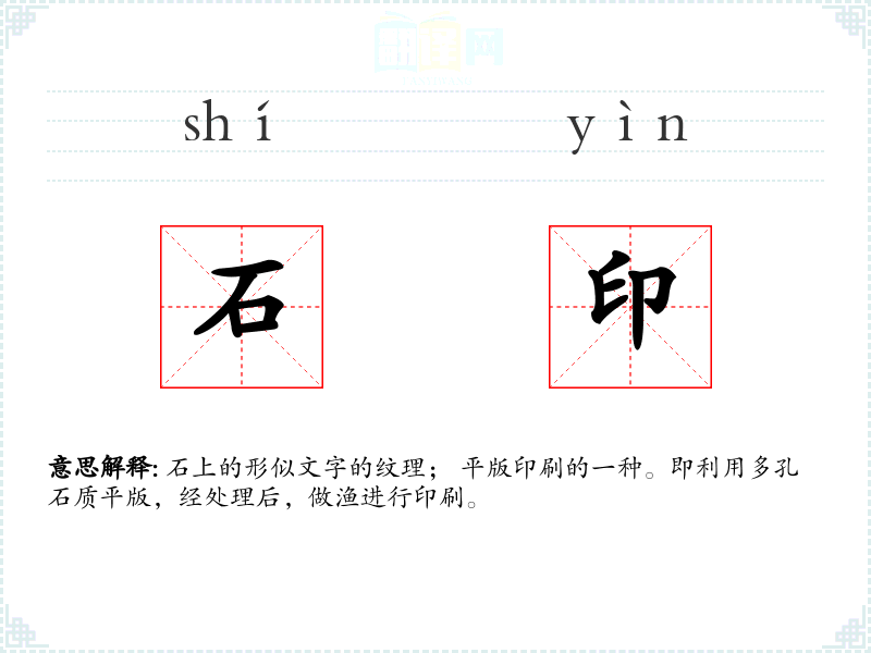 石上的形似文字的纹理; 平版印刷的一种。即利用多孔石质平版,经处理后,做渔进行印刷。