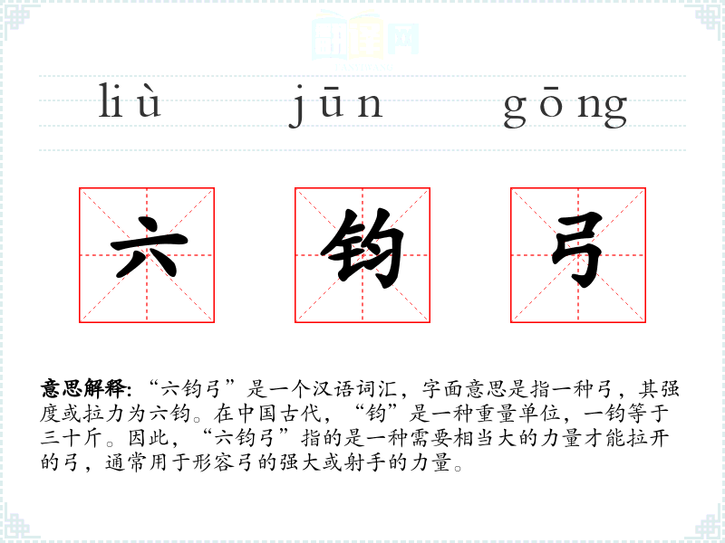“六钧弓”这个词汇源自**古代的度量衡系统,特别是与军事相关的兵器描述。随着时间的推移,这个词汇在现代汉语中使用较少,但在历史文献和特定文化背景下仍然保留其意义。