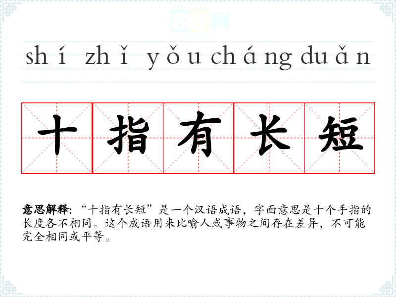 “十指有长短”是一个汉语成语,字面意思是十个手指的长度各不相同。这个成语用来比喻人或事物之间存在差异,不可能完全相同或平等。