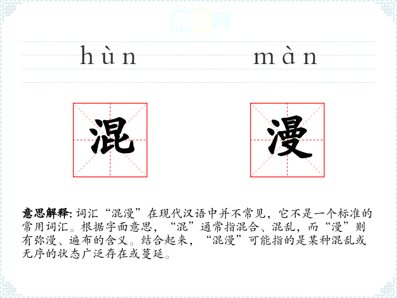词汇“混漫”在现代汉语中并不常见,它不是一个标准的常用词汇。根据字面意思,“混”通常指混合、混乱,而“漫”则有弥漫、遍布的含义。结合起来,“混漫”可能指的是某种混乱或无序的状态广泛存在或蔓延。