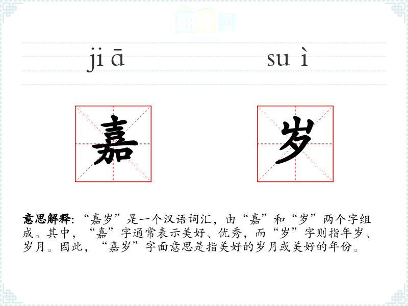 “嘉岁”是一个汉语词汇,由“嘉”和“岁”两个字组成。其中,“嘉”字通常表示美好、优秀,而“岁”字则指年岁、岁月。因此,“嘉岁”字面意思是指美好的岁月或美好的年份。