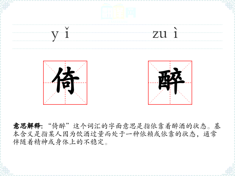 “倚醉”这个词汇的字面意思是指依靠着醉酒的状态。基本含义是指某人因为饮酒过量而处于一种依赖或依靠的状态,通常伴随着精神或身体上的不稳定。