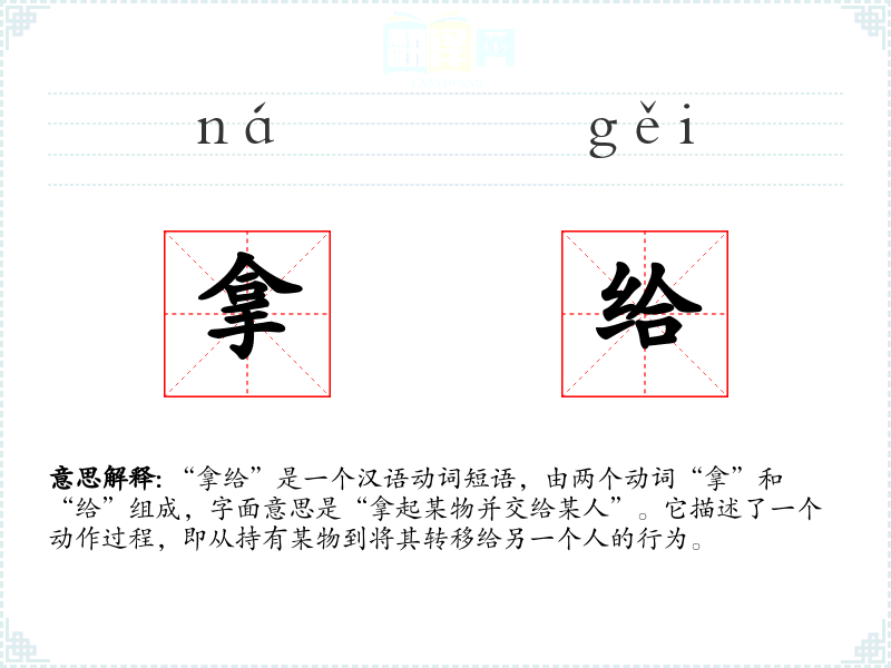“拿给”是一个汉语动词短语,由两个动词“拿”和“给”组成,字面意思是“拿起某物并交给某人”。它描述了一个动作过程,即从持有某物到将其转移给另一个人的行为。