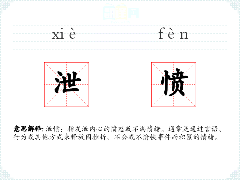 泄愤:指发泄内心的愤怒或不满情绪。通常是通过言语、行为或其他方式来释放因挫折、不公或不愉快**而积累的情绪。