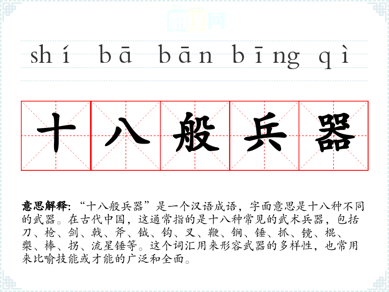 “十八般兵器”是一个汉语成语,字面意思是十八种不同的武器。在古代中国,这通常指的是十八种常见的武术兵器,包括刀、枪、剑、戟、斧、钺、钩、叉、鞭、锏、锤、抓、镋、棍、槊、棒、拐、流星锤等。这个词汇用来形容武器的多样性,也常用来比喻技能或才能的广泛和全面。