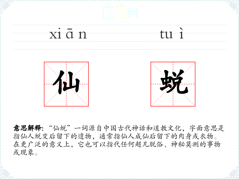 在文学作品中,“仙蜕”常用来形容那些超脱尘世、具有神秘色彩的人物或物品,如《聊斋志异》中的各种仙人故事。在口语中,这个词可能不太常用,但在讨论古代神话、道教文化或相关艺术作品时,可能会被提及。在专业领域,如道教研究、**古代文学研究中,“仙蜕”是一个重要的学术词汇。