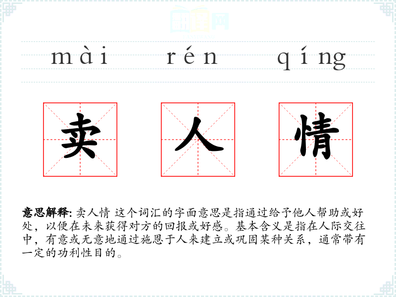 卖人情 这个词汇的字面意思是指通过给予他人帮助或好处,以便在未来获得对方的回报或好感。基本含义是指在人际交往中,有意或无意地通过施恩于人来建立或巩固某种关系,通常带有一定的功利性目的。