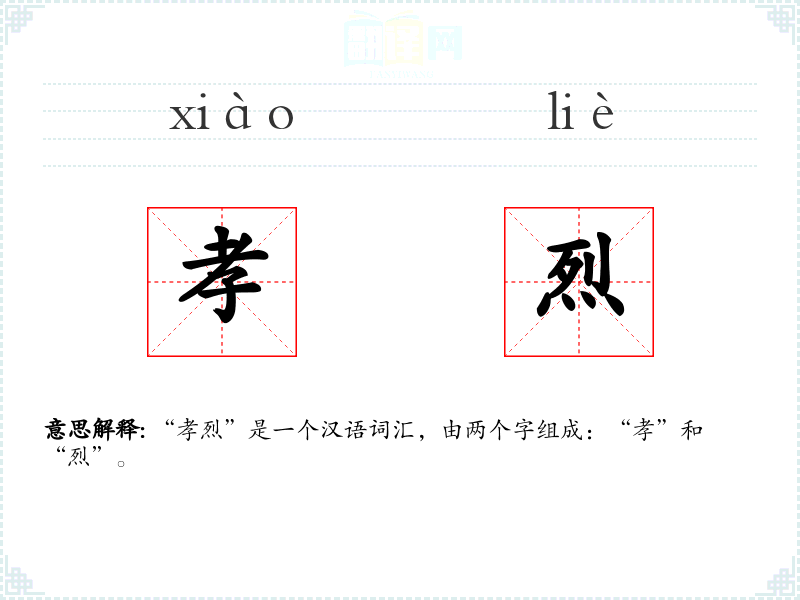 - 词源:“孝”和“烈”都是古代汉语中的常用词汇,分别代表孝顺和刚烈。