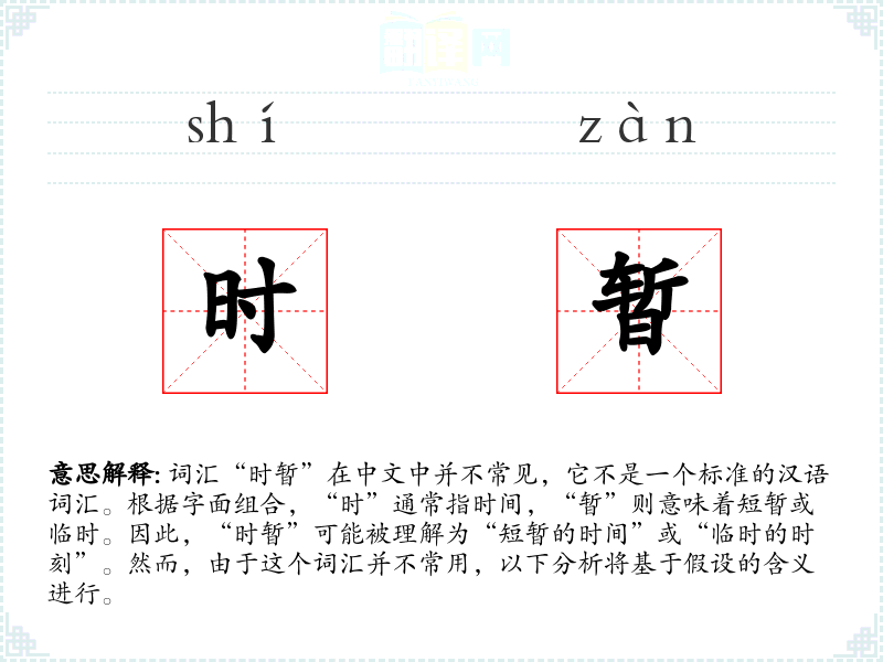 词汇“时暂”在中文中并不常见,它不是一个标准的汉语词汇。根据字面组合,“时”通常指时间,“暂”则意味着短暂或临时。因此,“时暂”可能被理解为“短暂的时间”或“临时的时刻”。然而,由于这个词汇并不常用,以下分析将基于假设的含义进行。