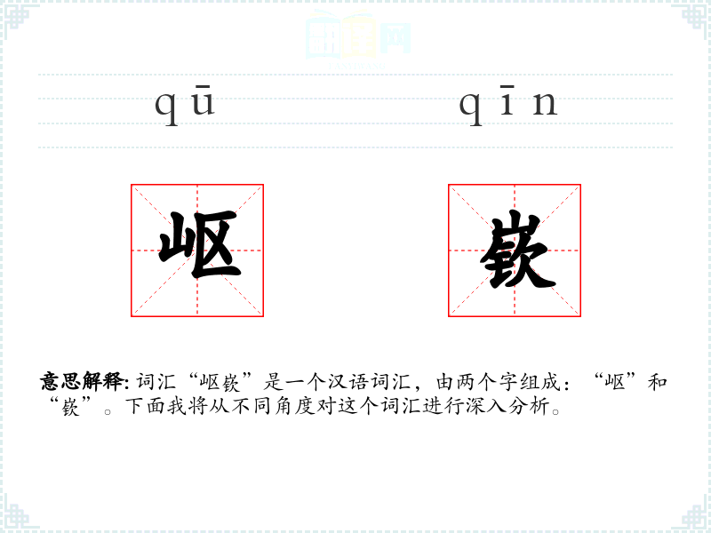 “岖”字的基本含义是指道路崎岖不平,难以行走;“嵚”字则指山势高耸险峻。结合起来,“岖嵚”形容的是地形险峻,道路崎岖不平,常用来形容山路的艰难。
